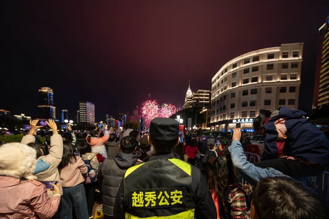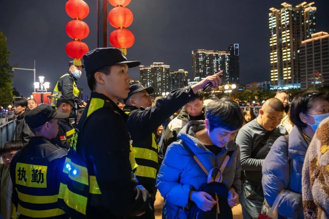 昨晚,全区保障烟花汇演的工作人员约1500人。他们严格值守在各自的网格点位上,紧密配合开展人员引导、警戒值守和巡逻防控。通过科学划分管控区域,并利用技术手段对人流、车流进行动态监测与智能疏导,有效保障了现场的整体秩序。