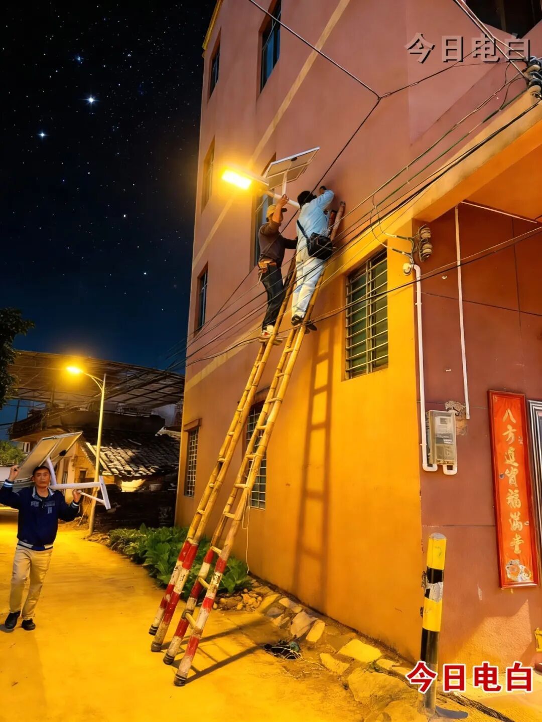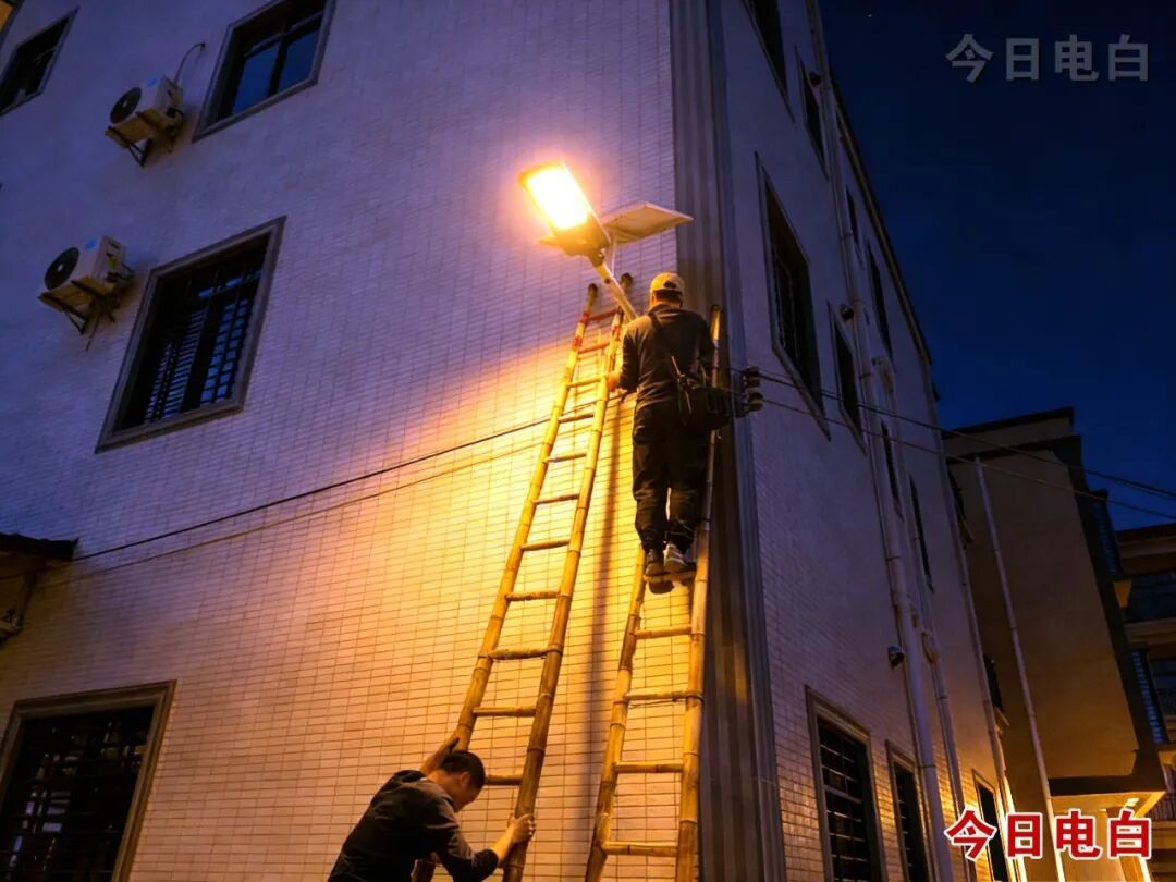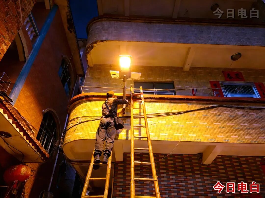 为让路灯精准覆盖每一条村道、惠及每一户群众,工作人员踏遍下平山村17个自然村的街巷角落,实地反复勘察、科学统筹规划,确定最优布设安装点位。项目施工期间,工人师傅们扛着竹梯、携着专业设备,穿梭于红砖老屋与新式民居间作业,不惧高空作业风险,严谨细致完成每一道施工工序,全力确保每一盏路灯都稳固规范安装、稳定正常点亮。