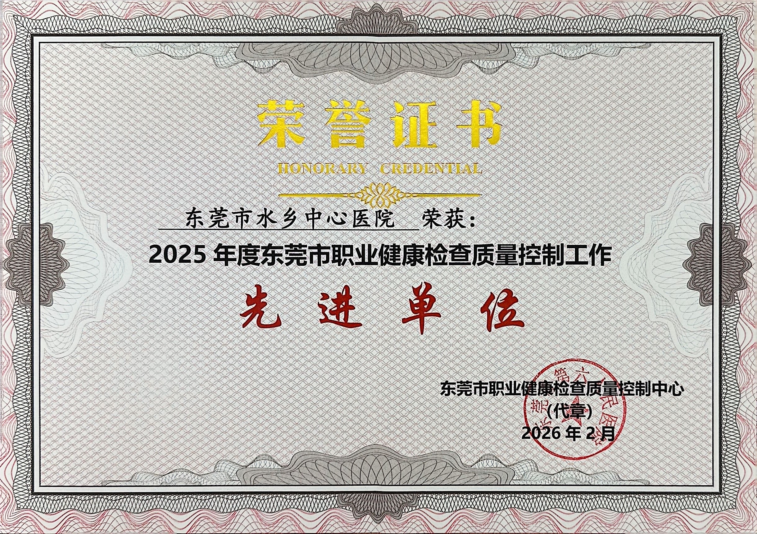 此次获评,是上级部门对医院专业技术与服务管理水平的充分肯定,也体现了医院主动担当、服务社会、支撑全市职业健康工作的责任意识。下来,东莞市人民医院水乡医院(东莞市水乡中心医院)将进一步完善职业健康检查质量控制体系,强化技术能力建设,持续优化职业健康检查服务流程,为辖区内企业和劳动者提供更专业、更精准的职业健康检查服务,切实筑牢职业健康防护屏障,为职业病防治工作贡献力量。