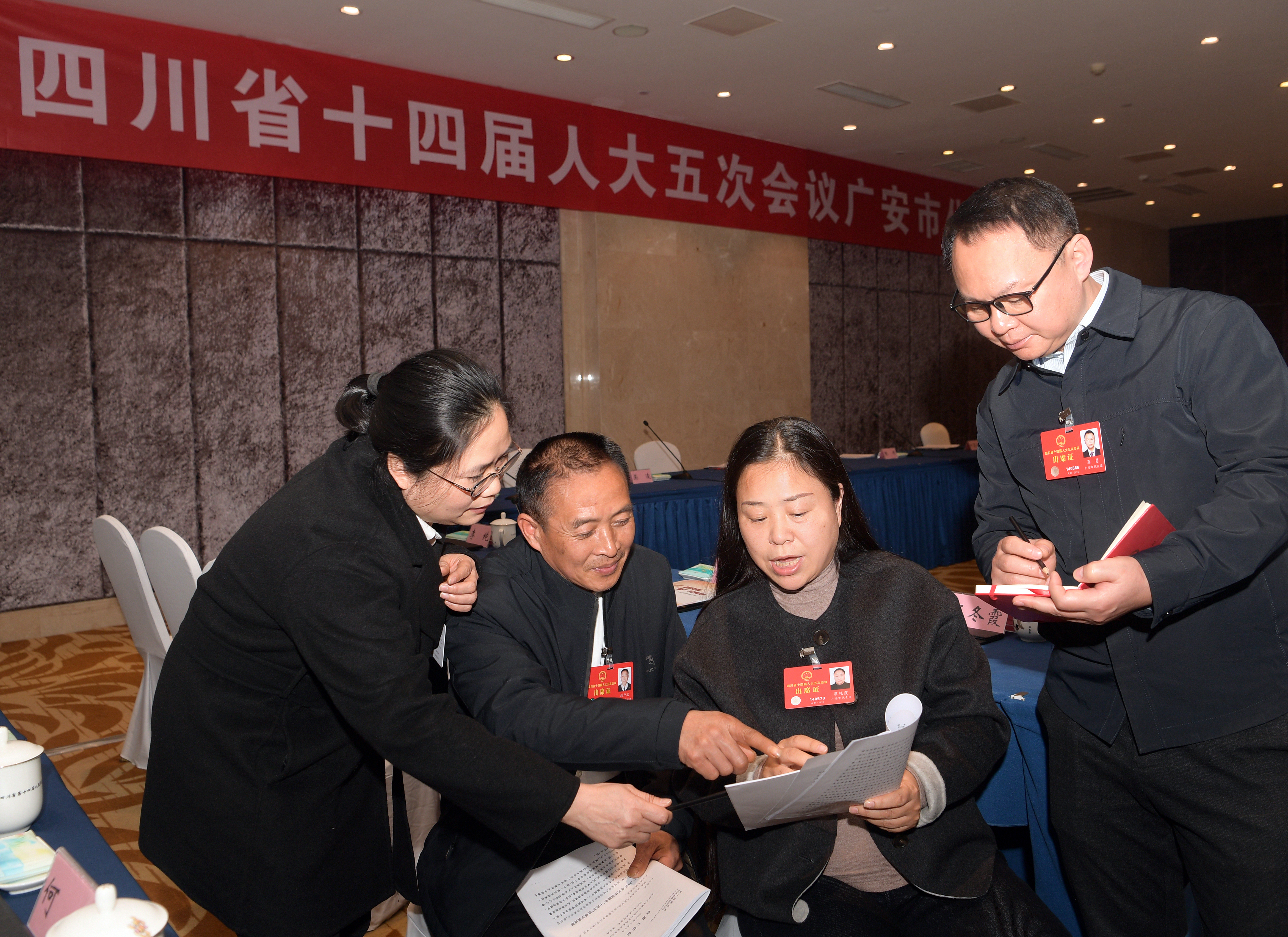 四川省人大代表、广安市武胜县十块田世纪甜橙专业合作社理事长刘开志(右二) 张飞 摄